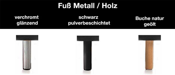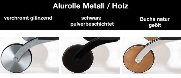 - Fußform Standard: Metall rund zylindrisch, verchromt glänzend, hinten Metallgabel verchromt glänzend mit Alurolle