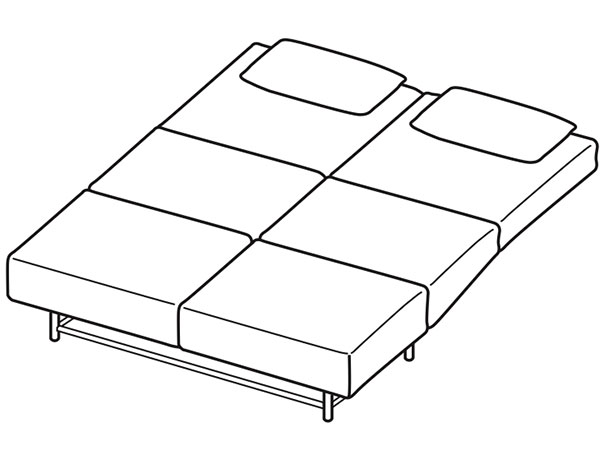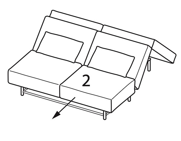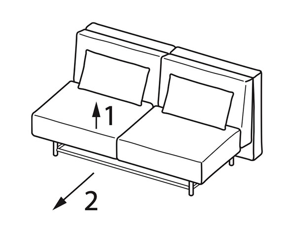 - Auszug zum Schlafsofa: Durch kurzes Anheben (1) und Ziehen (2) am vorderen Rahmen des Sofas entfaltet sich die Liegefläche.