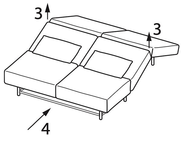 - Rückbau zum Sofa: Rückenteil an der Schlaufe anheben (3). Die Liegefläche lässt sich nun zusammenschieben (4).