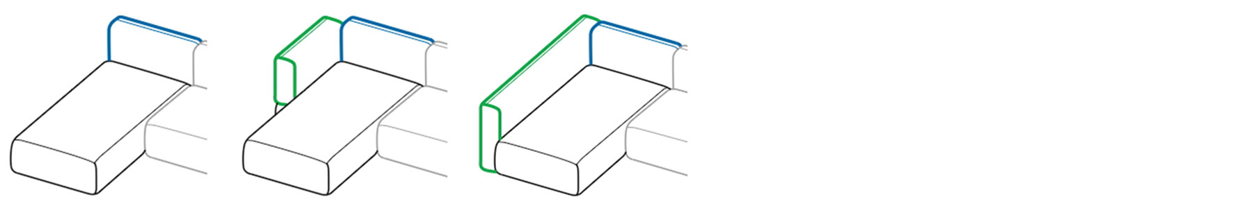 - Einzelsofa: immer mit fester Reling (nicht abklappbar) und